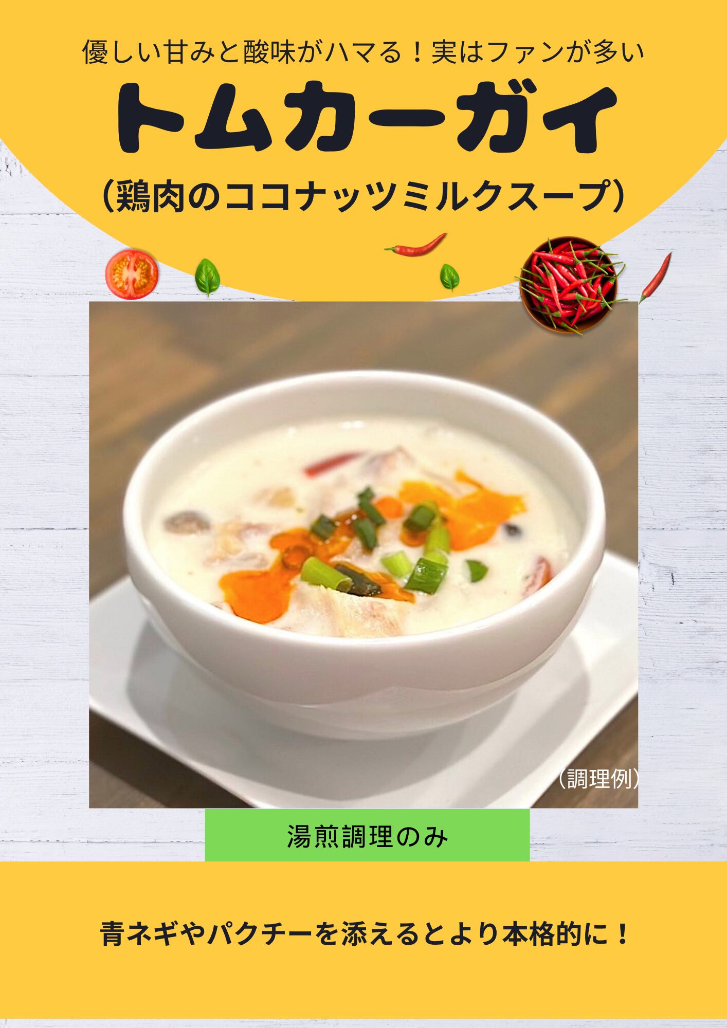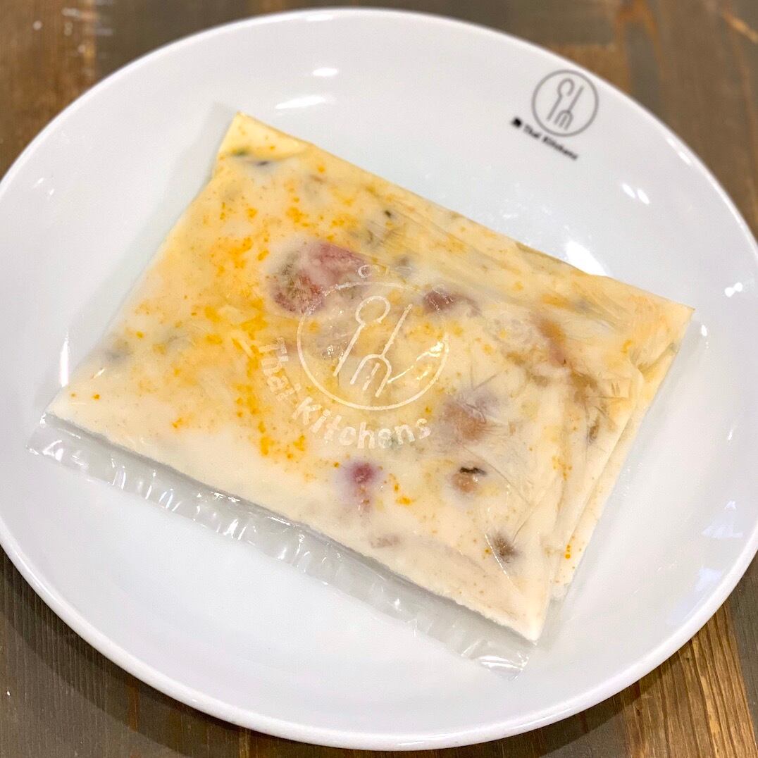 鶏肉・しめじ・赤玉ねぎ・赤唐辛子・ネギ・トマト・砂糖・ココナッツミルク・牛乳:ナンプラー・チリオイル・調味料(アミノ酸)